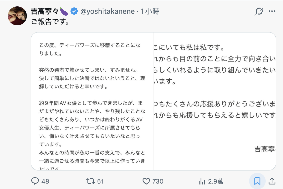 吉高宁々在X发表的声明是这么说的:这绝对不是一个轻率的决定,做为艾薇女艺人已经9年的时间了,还有很多没有完成的心愿,所以希望在新东家T-Powers的帮忙下全力以赴地朝目标前进?
