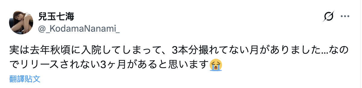 S1专属、经纪公司T-Powers所属的女艺人儿玉七海是在X和大家报告,因为在去年秋天生病住院没能照时间表拍片的缘故,所以她会跳过三个月的发片?