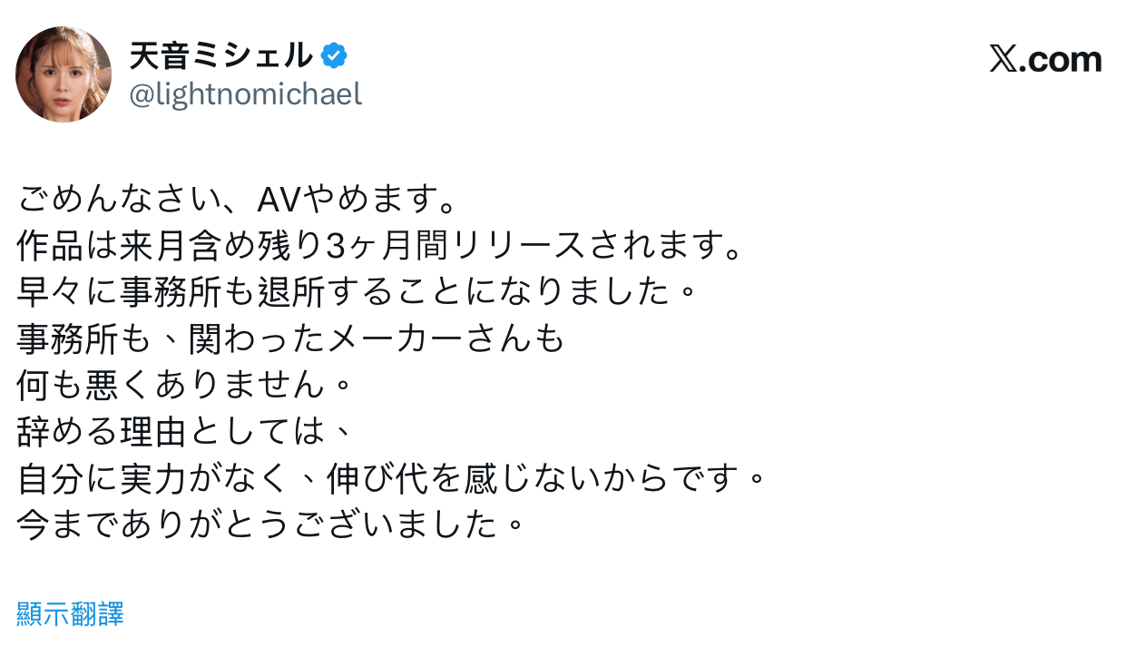 为什么呢?天音ミシェル(天音蜜雪儿)在自己的X写得很清楚,让我来做个简单的翻译: