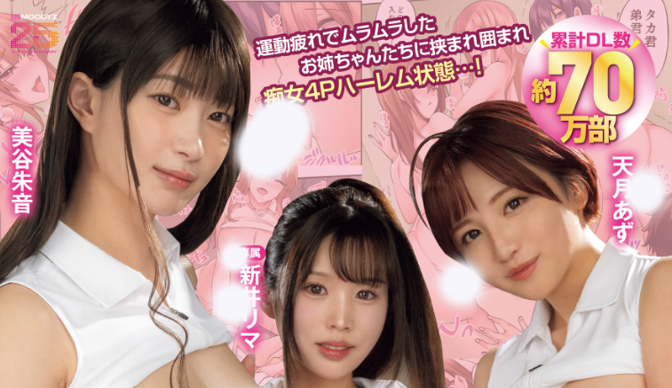 这是Moodyz要在11月17日发行的お姉ちゃんの忘れ物を届けに来たハズなのに…实写版 运动疲れでムラムラしたお姉ちゃんたちに挟まれ囲まれ痴女4Pハーレム状态…!:原作是绫枷家の猫,两人组的漫画家,非常擅长描写群交的大场面,所以?