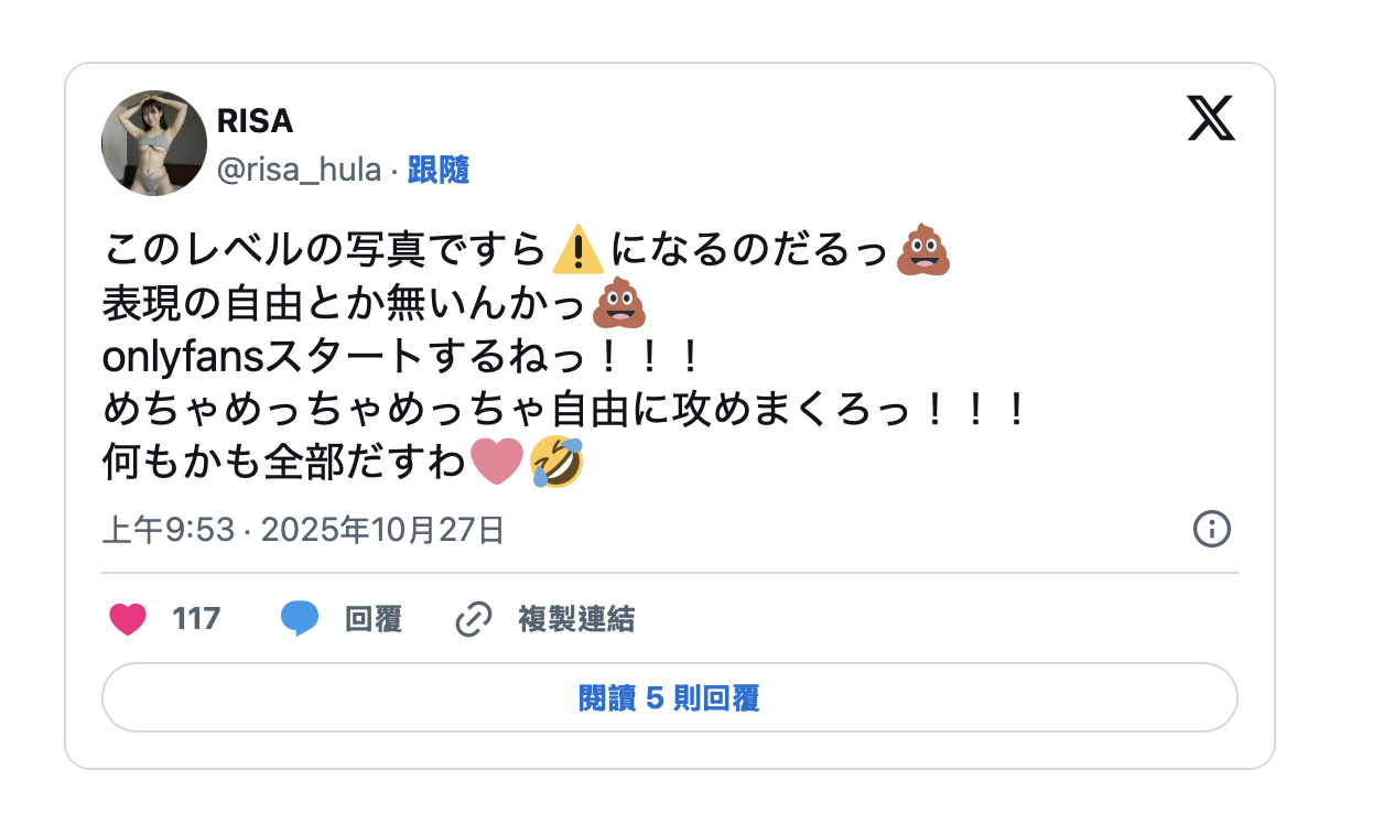 她在发文写了,要开启onlyfans 了,所以这几天她发了很多游走于尺度边缘的性感照片,应该就是为了onlyfans暖身;不过话说回来,自从她不做南沢海香后,有在注意发文的朋友应该都发现她凶的不得了,不是胸部很大的胸,而是脾气很大的凶,面对某些留言者的挑衅她讲话非常非常难听,狗屎的贴图用了很多?